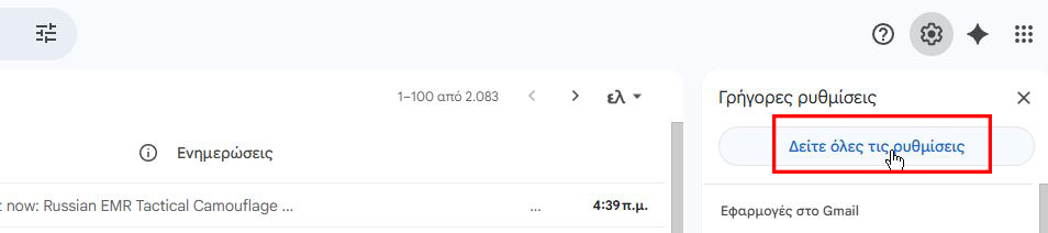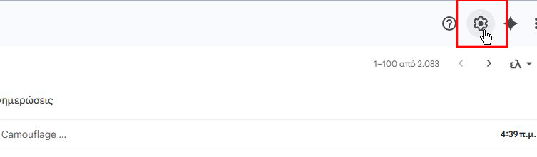 - Ανοίγετε το gmail σας και πατάτε το γρανάζι που θα βρείτε επάνω και δεξιά